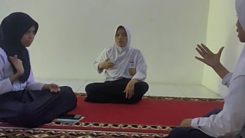 Para siswa tunarungu tampak fokus mengikuti bimbingan praktik pengucapan Dua Kalimat Syahadat menggunakan bahasa isyarat.